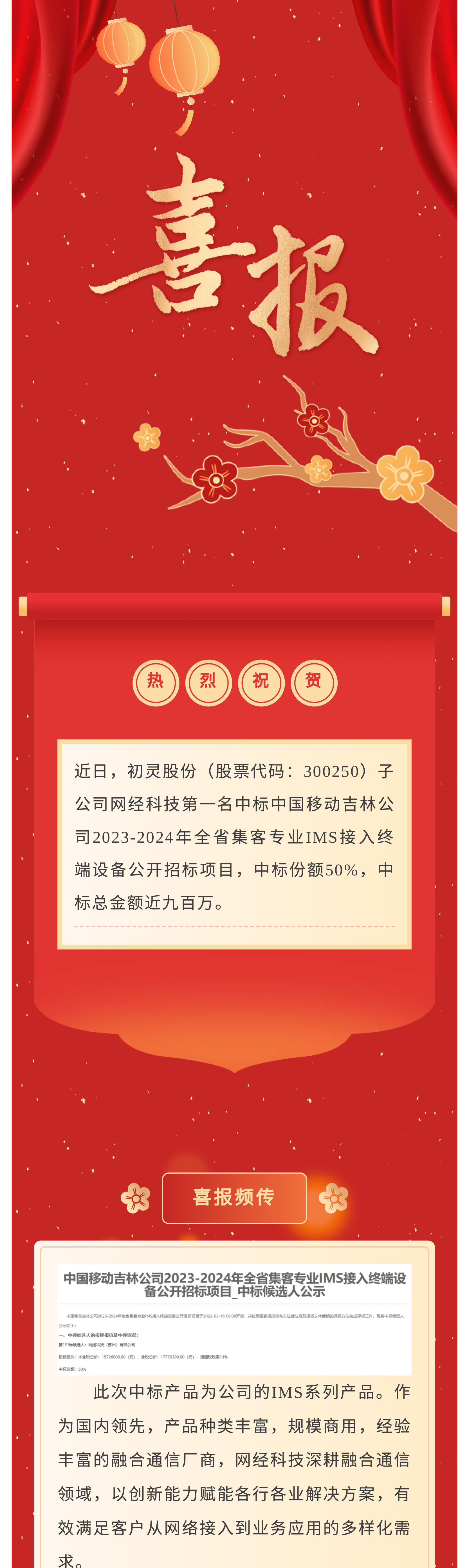 中标喜讯 | 初灵股份·智能连接·开云体育第一名中标中移吉林公司全省集客专业IMS接入终端设备项目
