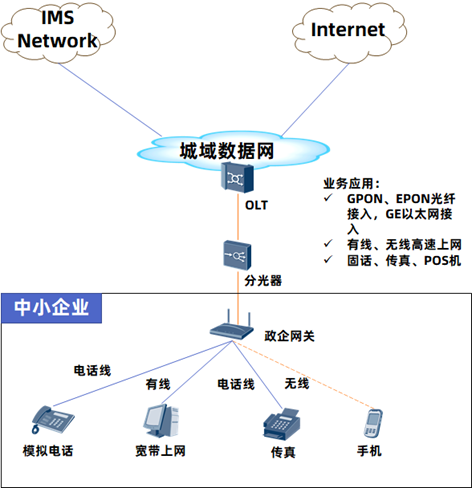 政企网关是企业网络的核心互联设备,作为面向中小企业的PON企业网关,产品具备路由交换、安全管理等功能,集成“光猫+路由+固话+行业融合应用“等功能为一体,通过一条光纤即可实现业务自动下发,满足企业通信、办公和娱乐等多种信息化需求。