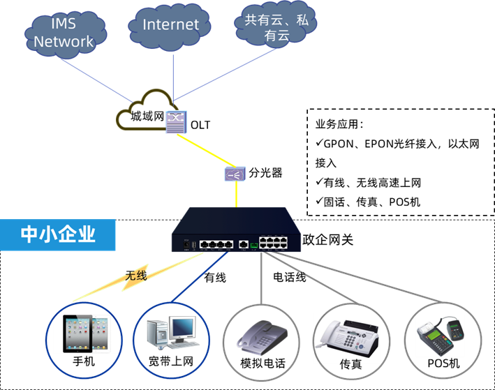 政企融合网关设备位置处于PON网络的边缘,用于接入企业客户,实现上网、语音、入云、分支互联等各类业务接入;包括ONU、基础路由、基础防火墙、IADLAN/WAN转换、WiFi等功能,支持GPON上行,支持GE接口、WIFIUSB接口。在企业内部,PC、电话、IAD等终端设备可以通过以太网、无线局域网等多种接口与政企融合网关设备互联。