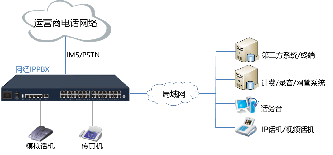 • 上行通过IP/E1中继方式与运营商电话网络互联